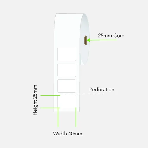 THERMAL DIRECT REMOVABLE 40MM X 28MM 1 LABEL ACROSS 2000/ROLL 25MM CORE, Minimum order 6 rolls.