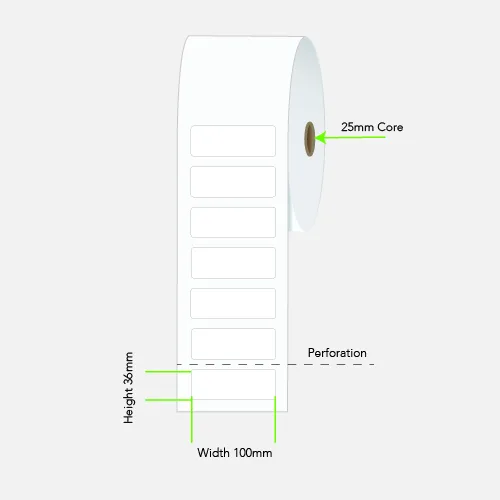 LABEL THERM PERM 100X36 1AC 750/R 25MM PERF, Minimum order 6 rolls.