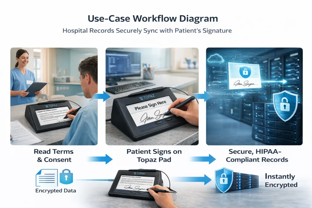 Topaz signature capture devices are enterprise-grade biometric hardware tools used to capture legally binding electronic signatures. Unlike basic tablets, they use patented electromagnetic digitizers to record forensic-quality signature data (speed, pressure, and rhythm), making them the industry standard for secure, paperless workflows in healthcare, finance, retail, and government.